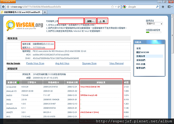 開啟http://www.VirSCAN.org/網頁,按〔瀏覽〕按鈕選取你覺得有問題的檔案後,再按上傳按鈕將可疑檔案上傳到VirSCAN.org網站中讓他分析,稍後一下就會看到下方有掃描結果了。